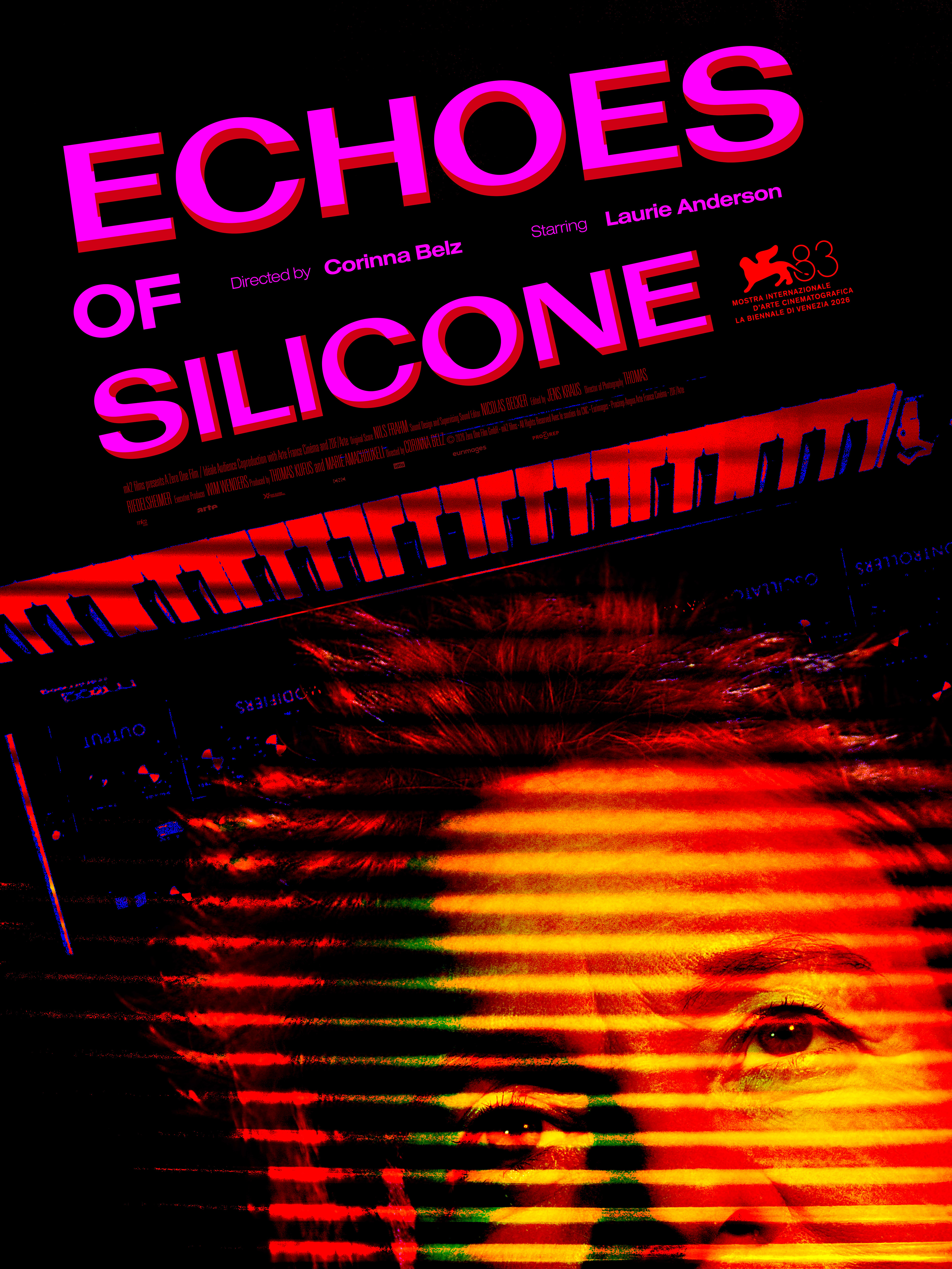 Création de l'affiche internationale d'un documentaire sélectionné à la Mostra de Venise (83e édition). La direction artistique joue sur la collision entre l'image du visage de l'artiste et l'univers des synthétiseurs analogiques, traitement chromatique saturé rouge/magenta, typographie massive en relief 3D, et effet de scanlines qui évoque à la fois l'esthétique des oscilloscopes vintage et la corruption du signal. Une image qui parle de musique sans en jouer une seule note.